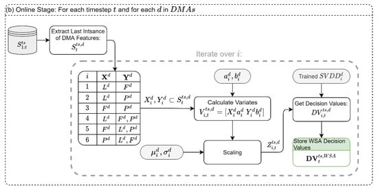 In the online stage of the WSA module, the parameters and the SVDD classifiers obtained in the offline stage are applied to the test dataset, , as illustrated in Figure 2b. In this stage, samples are fed to the system in real-time; this is demonstrated in Figure 2b by the growing index in the dataset, from which we only rely on the last instance . Then, using the scaling parameters and the vectors of the MCCA coefficients from the offline stage, the scaled variates, , are obtained. These variates are then classified using the trained SVDD models, , and the DVs are stored for the synthesis module. It is noteworthy that for each time instance , each DMA will result in six DVs corresponding to the six type combinations.