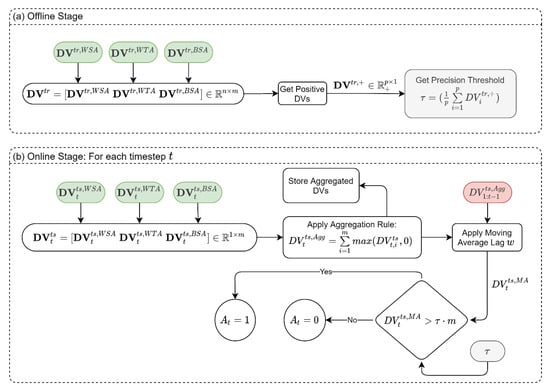 The previously described modules result in multiple SVDDs, each reporting its own DV, where positive DVs indicate outliers for the performed analysis. In the synthesis stage, we want to reach the final identification of the detection system state (Alarm, versus not Alarm, ) based on all the DVs obtained from the classifiers ensemble. That is, we need to develop an aggregation rule for all DVs. Figure 5 shows the synthesis module, which is also divided into offline and online stages. In the offline stage, we estimate the average precision of the SVDDs. As explained previously, the SVDDs are expected to produce small positive DVs even when tested for “normal” data. This can be attributed to the precision threshold in the SVDD training process. Therefore, we can estimate the mean precision by using the DVs that were stored in the training stage of the three modules (see green boxes in Figure 2a, Figure 3a and Figure 4a). To do so, the DVs from the three modules are joined together to form a matrix of DVs, , where is the number of observations in the training dataset and is the number of all SVDDs in the three modules. To estimate the average precision, , we average the positive entries in , as shown in Figure 5a. In the online stage, samples are fed to the system in real-time, while we only rely on the last DVs obtained from the three modules, which is a vector, , that aggregates the last updated DVs of the three modules . We then use the aggregation rule in Equation (5) to get a single scalar DV for timestep .