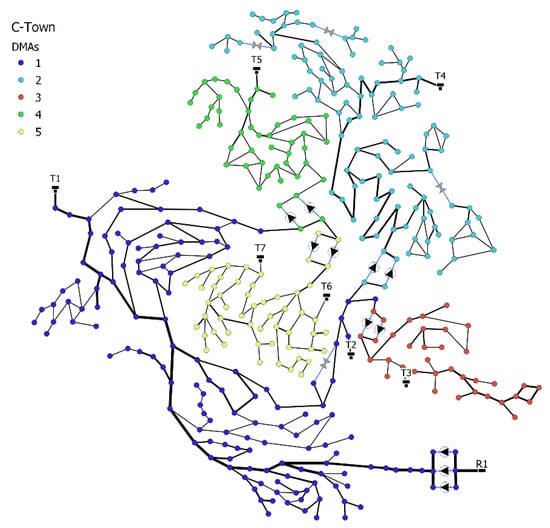 C-town WDS layout, DMAs by colored nodes, R1 is the water source, T1–T7 are the storage tanks, black triangles are pumps, gray triangles are valves, and pipe diameter is illustrated by the line thickness.