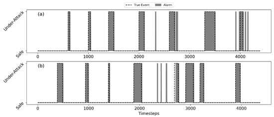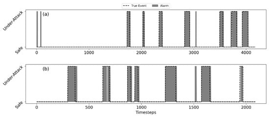 SSDS detection performance; alarms in gray, true events in dashed line; C-Town, Test 1 (a), Test 2 (b).