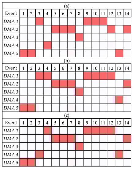 For each detected attack in Figure 8, each of the three modules will sum the positive DVs related to each DMA. Then the DMA with the maximum sum of positive DVs will be declared as the attacked DMA by the module. For example, in the WSA, we sum the positive DVs in during the detected event, and then the WSA module identifies the attacked DMA as the one with the maximum sum of positive DVs. Figure 8a shows the attacked DMAs identified by the WSA module in each of the 14 events in Test 1 and Test 2. Similarly, Figure 8b,c show the attacked DMA identified by the WTA and the BSA modules, respectively.