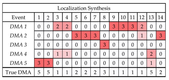 The votes from the three modules are aggregated, as shown in Figure 9. Figure 9 shows the votes (out of three) for each DMA and each event. The total number of votes in each event is three, and the DMA that gets the most votes is the most suspected to be the targeted DMA. The last row in Figure 9 also shows the true attacked DMA as detailed by the BATADAL events description []. Figure 9 shows that in 10 out of the 14 events, there is a complete consensus between the three modules on the true attacked DMAs. In events 3, 4, and 12, 2 out of 3 modules identified the correct attacked DMA. If we consider the majority voting rule, the only missed attack was event 13, identified as belonging to DMA 4 by two modules and DMA 5 only by the WSA module, while the true DMA was DMA 5.