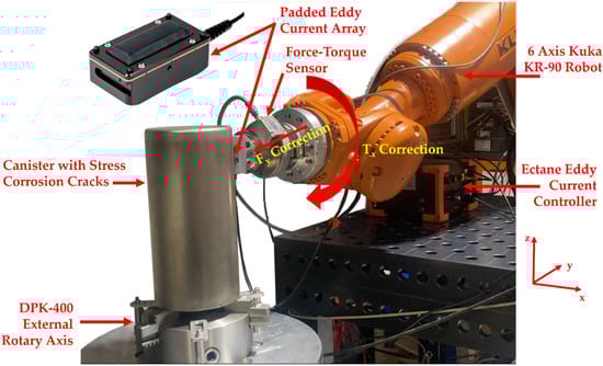 Figure 1 shows the experimental hardware used in the automated deployment of the eddy current system. A nuclear canister with a matrix of 16 stress corrosion cracks shown in Figure 2 is held within a mechanical chuck on top of a KUKA DPK-400 external rotary stage that has an angular resolution of 0.009°. The padded Eddyfi eddy current array (Part No: ECA-PDD-034-500-032-N03S) is mounted in a bespoke 3D-printed housing which is in turn secured to an IP-65 rated gamma force–torque sensor from ATI Industrial Automation (Apex, NC, USA) []. To move the sensor to the height of interest for the inspection, the eddy current array, 3D-printed housing and force–torque sensor assembly, are mounted to the flange of a KUKA KR-90 robot. Both the KR-90 and DPK-400 external rotary stages are controlled via a KRC 4 controller [].