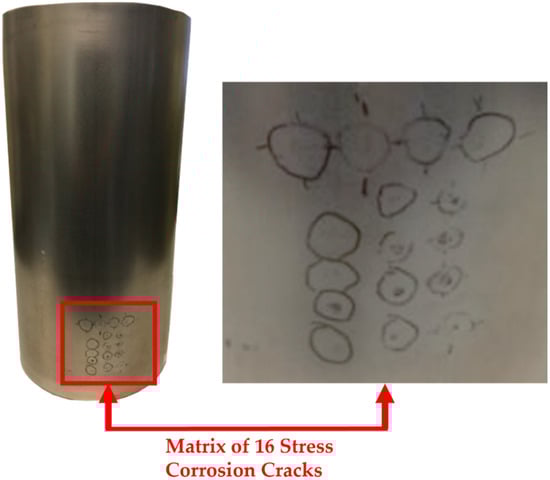 Canisters with a matrix of 16 stress corrosion cracks. Depositions of 5 µL droplets of sea water, 3.03 g/L of MgCl2, 15.2 g/L of MgCl2 and 30.03 g/L of MgCl2 were used to induce the cracks in the top row, left, central and right columns, respectively.