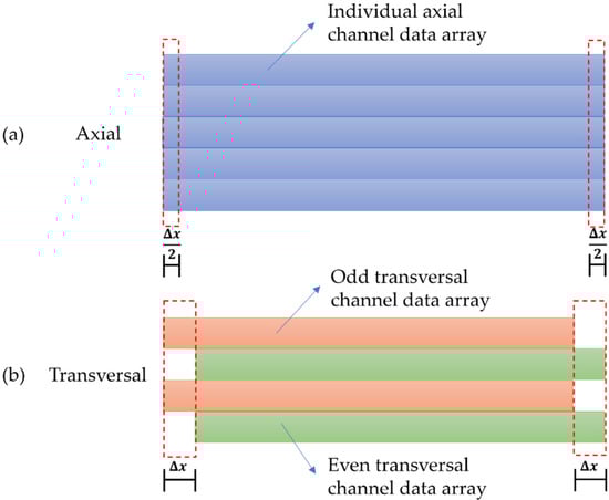 In order to ensure a common spatial grid, the first and last impedance data points corresponding to a distance of half the coil pitch are discarded within the axial complex array. By discarding the first set of data points that cover half the coil pitch, the axial complex array in the X-direction is synched with the first/odd column of the transversal dataset. Moreover, by discarding the last set of data points that cover half the coil pitch, the axial complex array in the X-direction is synched with the second/even column of the transversal complex array. This discarding of data is shown graphically in Figure 4a. The resulting data is then linearly interpolated in the Y-direction to align with the Y-coordinates of the transversal complex array.