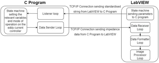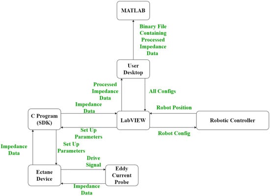 Extensive software infrastructure to control the eddy current Ectane device, as well as receive and process the acquired impedance data in real-time was developed and is documented in Figure 5. Literature has previously well documented the robotic software infrastructure required [,] and as a result, the work presented herein will focus on the eddy current software development effort.