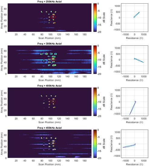 Phase-rotated axial vertical impedance component C−scan images at 250,300,400 and 450 kHz on a dB scale alongside impedance plane plots of the response from the highlighted defect.