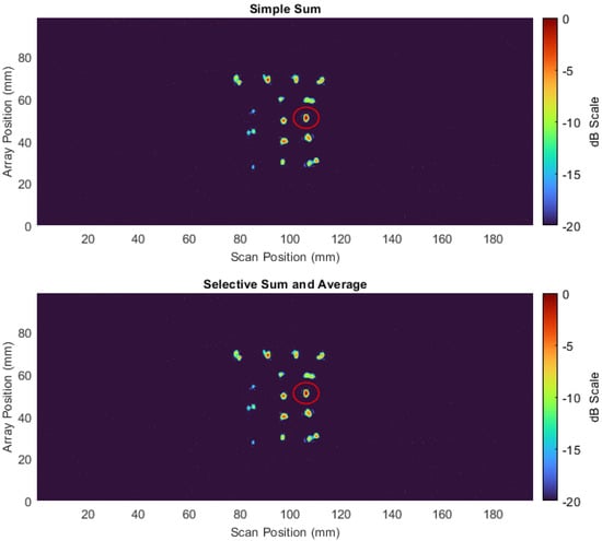 The resulting mixed C-scan image is shown in Figure 11. Table 3 documents the SNR of the highlighted defect. As is shown in Table 3, the SNR of the defect for the simple sum approximates to be the average across all four datasets that contributed to the mixed image, and as such it can be said the imaging performance has not been improved by this mixing methodology. Interestingly, this is a result that is also observed in ultrasound when fusing multi-modal Total Focused Method (TFM) images []. By contrast, the selective sum and average technique were able to boost the SNR by an average of 1.19 dB, demonstrating an increase in imaging performance.