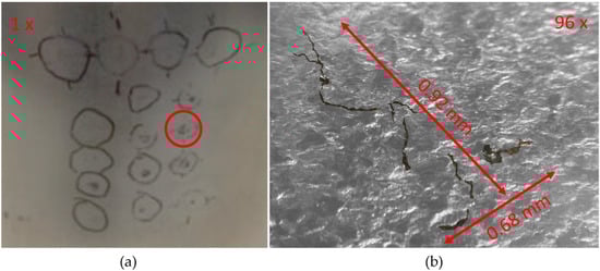 Photo of crack matrix and micrograph (a) Photo of crack matrix with the defect of interest highlighted in a red circle. (b) Micrograph of the defect of interest at 96× zoom with desaturated background.