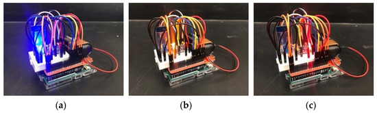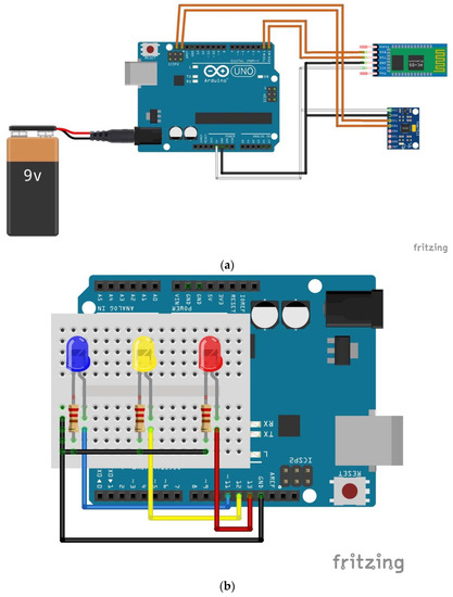 Jumper wires, 10 cm in length, made the following pin connections. In Figure 2a, for the GY-521 sensor connecting to Arduino Uno, VCC goes to 5 V, GND goes to GND, SCL goes to SCL, and SDA goes to SDA. For the HC-05 Bluetooth module, VCC goes to 5 V, GND goes to GND, RXD goes to pin 0, and TXD goes to pin 1. In Figure 2b, the positive ends of the blue, yellow, and red LEDs connected pins 11, 12, and 13 on Arduino Uno, respectively. The 220 Ω resistors connected the negative ends of each LED and GND.