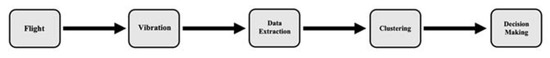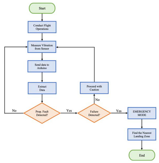 Figure 5 shows the UAV failure detection model flowchart for utilizing the five steps. The vibration measuring process involves the GY-521 sensor measuring in-flight vibration, sending the vibration data to Arduino, and data extraction. The first orange diamond block looks at propeller fault detection, and the second orange diamond looks at failure detection.