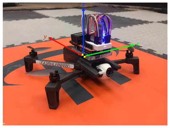 Figure 6 shows the Cartesian coordinate system for the quadcopter and hardware system combined, where the coordinate system directs the x- and y-axes along the horizontal plane and directs the z-axis orthogonal to the horizontal plane. The GY-521 sensor from the hardware system measures in-flight vibration signals for acceleration and gyro in the x-, y-, and z-directions. Next, the HC-05 Bluetooth module sends the vibration data from the Arduino Uno microcontroller to the computer, and Arduino IDE reads the vibration data, which contains three different propeller fault configurations (healthy, 1SFP, and 2SFP).