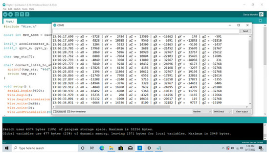 Arduino IDE displays the following six parameters with a written C++ code during each flight: aX, aY, aZ, gX, gY, and gZ (see Figure 7). We extracted the data by copying and pasting each parameter value into Excel. The input for each vibration graph is timestep (in minutes), and the output is one of the measured parameters (in least significant bit, LSB). Each vibration graph shows recorded data from the three propeller cases (healthy, 1SFP, and 2SFP). Since we obtained 15 flights in total during the experiment, we recorded data for five sets of three flights (S1 to S5).