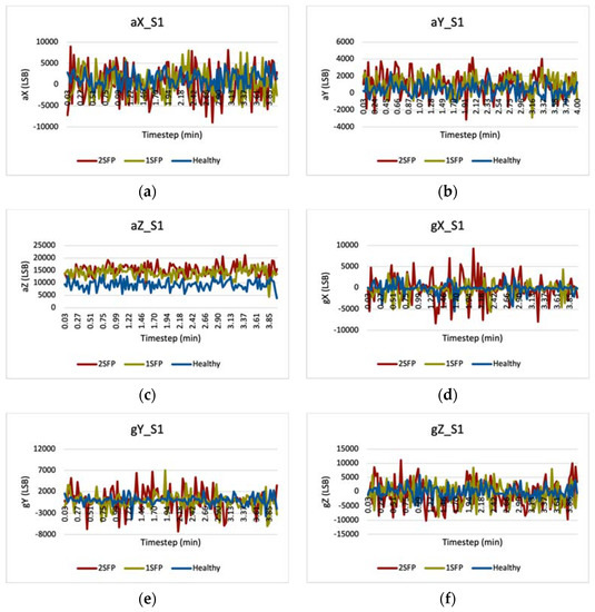 Figure 9 shows the vibration graphs for a flight set that contain readings for acceleration and gyro in the x-, y-, and z-directions. We used the GY-521 sensor for measuring vibration data, and read these values in the Arduino IDE software. The independent variable is timestep in minutes, and the dependent variables are the six measured parameters with units in least significant bit (LSB). Each graph compares the vibration data for different propeller fault configurations—healthy (blue), 1SFP (yellow), and 2SFP (red). Note that we only show the vibration graphs for flight set S1, as all other flight sets (S2 to S5) show similar trends.