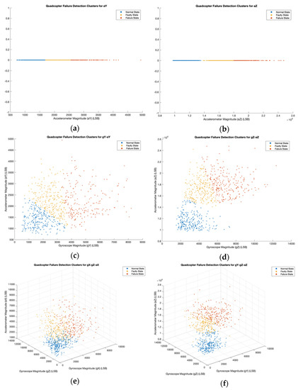 Each QFDC plot contained 750 points from datasets of selected parameters for dimensions between 1 and 6. Three health state clusters (normal state, faulty state, and failure state) contained these data points after running the k-means clustering algorithm. For n = 1, the QFDC plots were one-dimensional and arranged each data point in a horizontal line. For n = 2, x1 represented a gyroscope parameter, while x2 represented an accelerometer parameter. The QFDC plots showed these data points arranged in a two-dimensional plane. For n = 3, x1 and x2 represented the two gyroscope parameters, while x3 represented an accelerometer parameter. These plots showed data points scattered in a three-dimensional space. By looking at these QFDC plots, failure most likely occurred when each plot attained higher values for each chosen parameter. Each confusion matrix compared the health states for each data point between the actual label and the clustering label. For n = 4, 5, and 6, though we provided no QFDC plot for higher dimensions, their confusion matrices provided sufficient information for calculating performance metrics. The top three parameter sets are gZ-aZ, gY-gZ-aZ, and gY-gZ-aY-aZ, with accuracies of 92.1%, 81.7%, and 77.3%, respectively (Table 5).