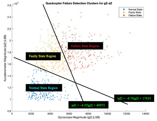 Since the parameter set gZ-aZ has the highest accuracy of 92.1% (see Table 5), we chose this parameter set to move forward with decision-making, the last step of the UAV failure detection system, using the LED subsystem. Three LEDs (blue, yellow, and red) turn on one at a time based on specified constraints. We set up boundary conditions with equations for two linear lines that separate the three different cluster regions: normal state region, faulty state region, and failure state region. Their equations are determined in slope-intercept form by using two points on a line that separate two regions, and we calculate their slope. Figure 11 shows the chosen QFDC plot with indicated regions and their linear equations.