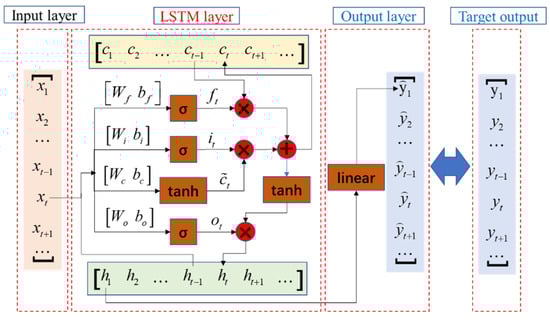 The LSTM network utilized in this paper consists of three parts: the input layer, the LSTM cycle module and the output layer (fully connected layer), as shown in Figure 2. The sets of input sequences, cell states, hidden states, output sequences and target sequences in the LSTM network are denoted as , , , and separately. The cell state and hidden state can be updated by Equation (2), and the output sequence can be calculated by Equation (3):