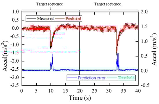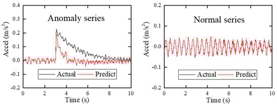 As mentioned earlier, for all of the training sets, validation sets and threshold sets are picked out from historical normal SHM data. The well-trained LSTM network will then perform good prediction ability with normal target sequences and poor prediction ability with abnormal target sequences, as shown in Figure 3. Therefore, the prediction error of well-trained LSTM network can reflect the anomalous possibility of target sequences, and the prediction error of each sampling point in target sequences can be calculated by Equation (6):