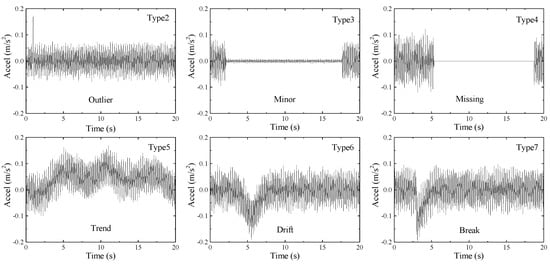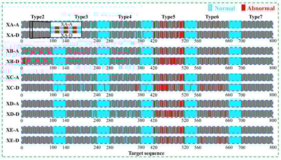In order to verify the universality of the proposed anomaly detection method, six kinds of abnormal patterns are designed for each test set, which are outlier (Type 2), minor (Type 3), missing (Type 4), trend (Type 5), drift (Type 6), and break (Type 7), respectively, as shown in Figure 4. The method of building abnormal input sequences and corresponding abnormal target sequence is to replace normal data with abnormal data. As a result of each test set, the abnormal pattern of input sequences 1–100 is type 2, 141–240 is type 3, 281–380 is type 4, 421–520 is type 5, 561–660 is type 6, 701–800 is type 7. The unchanged input sequences are labeled as normal (Type1).