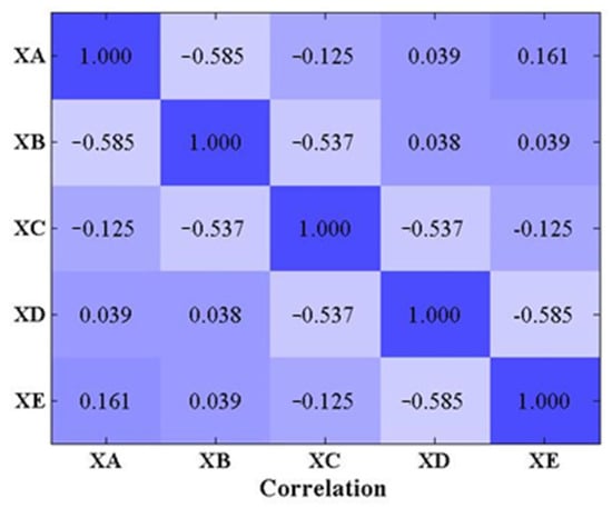 To determine the number of LSTM networks established, the correlation coefficients of abnormal input sequences in the five test sets are shown in Figure 5. Since the noise ratio of the response is 20%, the threshold for the correlation coefficient is set at 80%. According to the calculation results in Figure 5, five LSTM networks need to be established to predict the above five response data, and they are named Net1, Net2, Net3, Net4, and Net5.