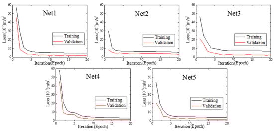 During the training processes, the basic parameters of the five designed networks are set as follows: the input and output dimensions of the networks are 270 and 250, respectively, the batch size is 256, dropout is 0.3, and epoch is 20. The activation function of the fully connection layer is linear function, the loss function is the mean square error (MSE). These networks are trained using Adam optimizer. The mean square errors on training sets and validation sets of each network are shown in Figure 6. It can be seen that all of these networks converge gradually with increasing of iterations (epochs).