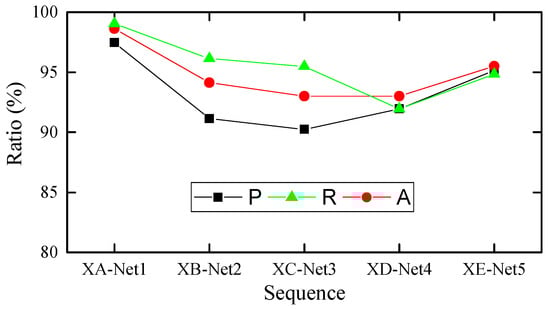 In order to further illustrate the effectiveness of the proposed anomaly detection method in identifying various abnormal patterns, Table 3 shows the detection results of six abnormal patterns in each test set. From the Table 3, it can be seen that the proposed method can achieve good detection results for six abnormal patterns. Precision, recall, and accuracy are calculated to evaluate the overall performance of the proposed method in each test set, as shown in Figure 7, and the actual anomaly layout and the detection results are compared in Figure 8.