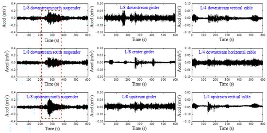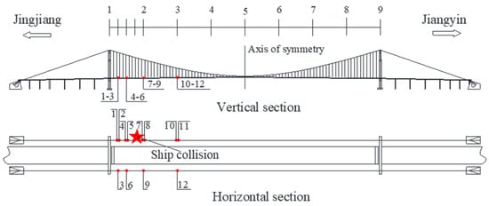 To further illustrate the extensive applicability of the proposed method, the acceleration data of a long-span suspension bridge located in Jiangyin, China is employed. According to historical official records, the Jiangyin Bridge was hit by a ship in 2 June 2005, and the impact location on the main girder of the bridge is shown in Figure 9. Figure 10 shows the typical response data of the accelerometers on the suspender, girder and main cable which are closest to the ship impact position, respectively. As can be seen from Figure 10, the acceleration data of the suspenders is most sensitive to ship impact accidents. Therefore, the accident of ship collision can be easily identified based on suspenders’ acceleration data. A total of 12 accelerometers are installed on the suspenders of Jiangyin Bridge, as shown in Figure 9.