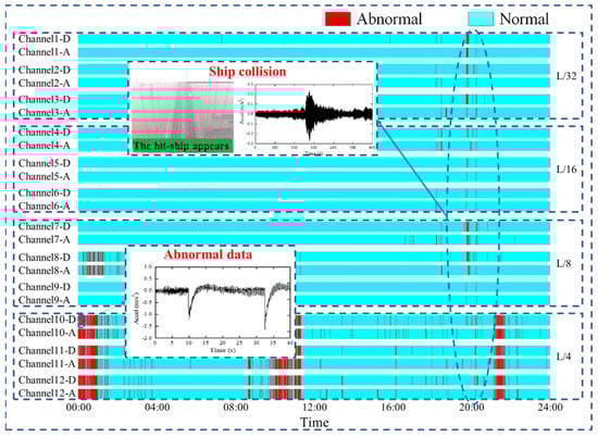 The human labeled results and networks detection results of 12 channels are compared in Figure 13. The ship collision accidents can be quickly located while the acceleration data of 12 channels are detected as anomaly at the same time point. The accuracy of detection results in each channel are given in Table 5, and it can be seen that the proposed method performs well in real bridge data processing and exception event warning.