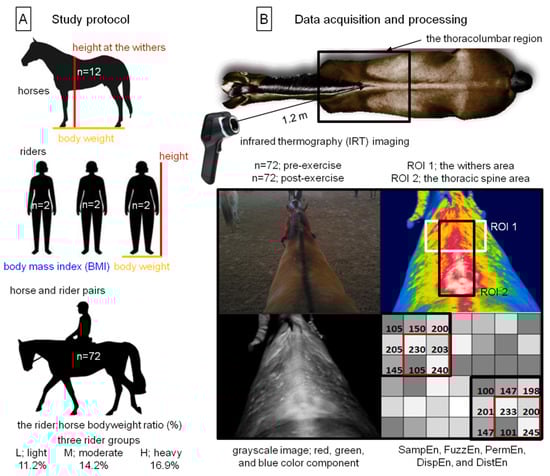 Schema of the material and methods used in the study. (A) The study protocol included horses (n = 12); riders (n = 6); and horse and rider pairs (n = 72), representing three rider groups that differed depending on the rider:horse bodyweight. (B) Data acquisition and processing included pre- and post-exercise infrared thermography (IRT) imaging of the thoracolumbar region; segmentation of two regions of interest (ROIs); thermal images converted into the grayscale images and three color components (red, green, blue); and extraction of the following five entropy measures: two-dimensional sample entropy (SampEn), two-dimensional fuzzy entropy (FuzzEn), two-dimensional permutation entropy (PermEn), two-dimensional dispersion entropy (DispEn), and two-dimensional distribution entropy (DistEn).