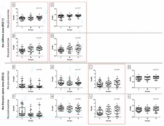 The comparison of the selected entropy measures in the red color component between light (L), moderate (M), and heavy (H) rider groups. The withers area (ROI 1) (A–D) and the thoracic spine area (ROI 2) (E–L) are separated by a solid horizontal line. The images obtained pre-exercise (A,C,E,G,I,K) and post-exercise (B,D,F,H,J,L) are separated by dashed horizontal lines. The following entropy measures are considered: DispEn—two-dimensional dispersion entropy (A,B,I,J), DistEn—two-dimensional distribution entropy (C,D,K,L), SampEn—two-dimensional sample entropy (E,F), FuzzEn—two-dimensional fuzzy entropy (G,H). Data are presented using minimum and maximum values, lower and upper quartiles, and median. The mean value is marked by a cross. Differences between rider groups were indicated with individual p-values when p < 0.05. Different superscripts on each plot were statistically different. Measures that differ between rider groups (L, M, H) are marked with a red frame.
