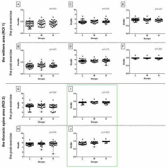 The comparison of the selected entropy measures in the green color component between light (L), moderate (M), and heavy (H) rider groups. The withers area (ROI 1) (A–F) and the thoracic spine area (ROI 2) (G–J) are separated by a solid horizontal line. The images obtained pre-exercise (A,C,E,G,I) and post-exercise (B,D,F,H,J) are separated by dashed horizontal lines. The following entropy measures are considered: PermEn—two-dimensional permutation entropy (A,B), DispEn—two-dimensional dispersion entropy (C,D,G,H), DistEn—two-dimensional distribution entropy (E,F,I,J). Data are presented using minimum and maximum values, lower and upper quartiles, and median. The mean value is marked by a cross. Differences between rider groups were indicated with individual p-values when p < 0.05. Different superscripts on each plot were statistically different. Measures that differ between rider groups (L, M, H) are marked with a green frame.