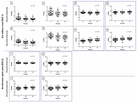 The comparison of the selected entropy measures in the blue color component between light (L), moderate (M), and heavy (H) rider groups. The withers area (ROI 1) (A–H) and the thoracic spine area (ROI 2) (I–L) are separated by a solid horizontal line. The images obtained pre-exercise (A,C,E,G,I,K) and post-exercise (B,D,F,H,J,L) are separated by dashed horizontal lines. The following entropy measures are considered: SampEn—two-dimensional sample entropy (A,B), FuzzEn—two-dimensional fuzzy entropy (C,D), DispEn—two-dimensional dispersion entropy (E,F,I,J), DistEn—two-dimensional distribution entropy (G,H,K,L). Data are presented using minimum and maximum values, lower and upper quartiles, and median. The mean value is marked by a cross. Differences between rider groups were indicated with individual p-values when p < 0.05. Different superscripts on each plot were statistically different. Measures that differ between rider groups (L, M, H) are marked with a blue frame.