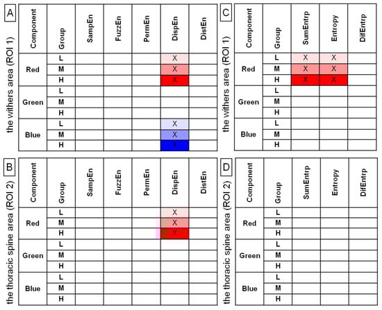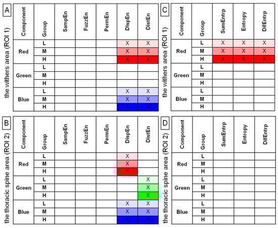 Entropy measures (A,B) and selected gray-level run-length matrix features (C,D) for examined color components (red, green, blue), which were considered to increase in a similar way throughout the light (L), moderate (M), and heavy (H) rider groups on the post-exercise imaging. Data were presented separately for the withers area (ROI 1) (A,C) and the thoracic spine area (ROI 2) (B,D). SampEn—two-dimensional sample entropy, FuzzEn—two-dimensional fuzzy entropy, PermEn—two-dimensional permutation entropy, DispEn—two-dimensional dispersion entropy, DistEn—two-dimensional distribution entropy, SumEntrp—summation entropy, entropy, DifEntrp—differential entropy. The similar measures were marked by color (light red, green, blue for L group; moderate red, green, blue for M group; and dark red, green, blue for H group) and by a cross (X).