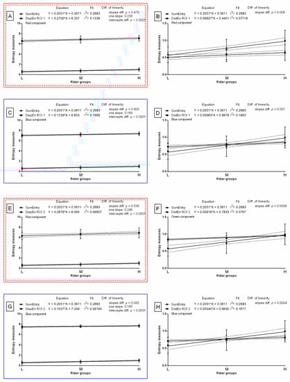 Comparison of studied entropy measures (DispEn—two-dimensional dispersion entropy, DistEn—two-dimensional distribution entropy) and selected gray-level run-length matrix feature (SumEntrp—summation entropy) for examined color components (red, (A,B,E); green, (F); blue, (C,D,G,H)), which were found to be significantly different between light (L), moderate (M), and heavy (H) rider groups on the post-exercise imaging. Data were presented separately for the withers area (ROI 1) (A–D) and the thoracic spine area (ROI 2) (E–H). Similarity was tested using linear regressions. A p-value of less than 0.05 was considered significant. If the difference between slopes was not significant, a single slope measurement was calculated. Plots with the entropy measures and slopes that did not differ with SumEntrp were marked by colored (red, blue) solid frames. Plots with the entropy measures and slope values that were higher than SumEntrp were marked by colored (red, blue) dashed frames.