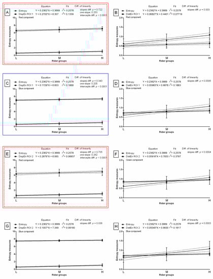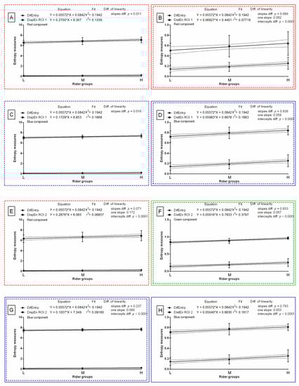 Comparison of studied entropy measures (DispEn—two-dimensional dispersion entropy, DistEn—two-dimensional distribution entropy) and selected gray-level run-length matrix feature (DifEntrp—differential entropy) for examined color components (red, (A,B,E); green, (F); blue, (C,D,G,H)), which were found to be significantly different between light (L), moderate (M), and heavy (H) rider groups on the post-exercise imaging. Data were presented separately for the withers area (ROI 1) (A–D) and the thoracic spine area (ROI 2) (E–H). Similarity was tested using linear regressions. A p-value of less than 0.05 was considered significant. If the difference between slopes was not significant, a single slope measurement was calculated. Plots with the entropy measures and slopes that did not differ with DifEntrp were marked by colored (red, green, blue) solid frame. Plots with the entropy measures and slope values that were higher than DifEntrp were marked by colored (red, green, blue) dashed frames.