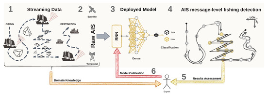 - de Souza, E.N.; Boerder, K.; Matwin, S.; Worm, B. Improving fishing pattern detection from satellite AIS using data mining and machine learning. PLoS ONE 2016, 11, e0158248. [Google Scholar]