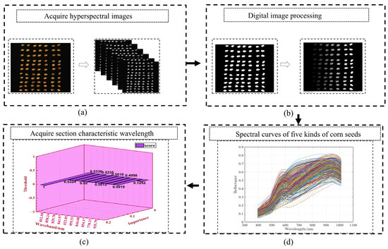Corn has a reputation as a “golden crop”; even though the seed is small, the crop is vital to China and plays a major role in the international trade in corn seeds. It is of great significance that there are independent and controllable seed sources in the seed industry. High temperature and humidity cause mold to grow on seeds, reducing their germination rates, as well as their quality and nutritional value [1,2]. Over the past few decades, crop diseases have been a frequent cause of crop yield reduction, and their cause must be determined by studying the diseased seeds [3,4]. The seed industry must speed up the promotion of corn seed science, perform efficient seed discrimination, achieve independent self-improvement, and be able to control seed quality independently. Chemical composition analysis is the approach that provides the most precise indication of the level of mold present [5]; however, there is inevitably some damage to the sample, as well as subjective considerations, in the process of analysis [6]. A new and innovative technological tool has emerged in recent years for the nondestructive testing of seeds, known as hyperspectral imaging [7,8,9,10]. Hyperspectral remote sensing imaging (HRSI) uses spectral signatures to identify, detect, and discriminate between objects of varying spectral characteristics [11]. The results are directly proportional to the spectral resolution of the sensor and how much information is stored in each band [12]. Sensors with high resolution tend to have bands that are much tighter than those with low resolution. HRSI is based on a narrow band that combines spatial information and hundreds of channels of spectral information so that the chemical and structural information of seeds may be combined using this technology, which can be used for both extracting aberrant information and determining its spatial distribution [13,14]. A machine learning algorithm can be constructed to categorize crops by using multispectral and multi-temporal images. Both anomalous information and spatial distribution may be obtained if one takes the initiative. On the one hand, the sample does not have to be destroyed during the experiment, so the method is both efficient and nondestructive. On the other hand, the image information from the imaging spectrometer offers research assistance for computer vision. The first consideration is the choice of the featured wavelength. Yang Sai et al. [15], to identify corn seeds, employed a joint skewness technique to select feature wavelengths, and when this was paired with a support vector machine, the model’s classification accuracy increased to 96.28%. However, the value of the skewness distribution is more affected by symmetrical distributions on both sides of the distribution. A one-way tailspin is a tail that spins in one direction. Positive (negative) skewness indicates the tail’s direction of rotation more than its tendency to spin [16]. The second consideration is the selection of the classification algorithm. The hyperspectral imaging distinction and linear discriminant analysis performed by Ali Mohammadi F et al. [17] correctly classified three different types of maize kernels with an accuracy of 95%. After using the watershed technique to partially segment moldy peanuts, Jiang et al. [18] determined the classification impact from their data. Yuan et al. [19] used a support vector machine (SVM), partial least squares discriminant analysis (PLS-DA), and a cluster-independent pattern classifier (SIMCA). Both used dimensionality reduction data and then directly applied machine learning models for classification.