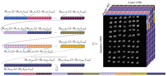 For better presentation of the three-dimensional data, these data are converted into two-dimensional data to make it more obvious. As depicted in Figure 3, the scanning of maize seeds through a hyperspectral imaging system generates three-dimensional images consisting of 1500 lines, 1600 samples, and 462 bands. Each band’s arrangement can be better understood by using binary expansion.