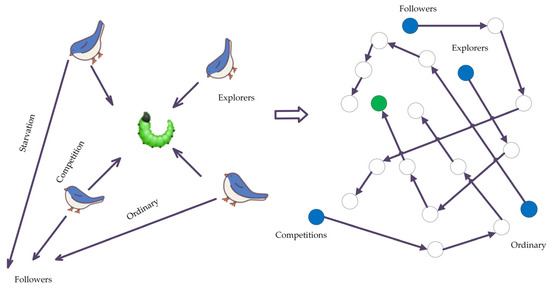 A traditional SSA divides S into three categories based on their energy levels during foraging: explorers, followers (starvation, competition, and ordinary gradual followers), and probers. In the subsection on the S search process, it can be seen that the finder is in the middle and the first to find food from a safe position, as shown in Figure 4.