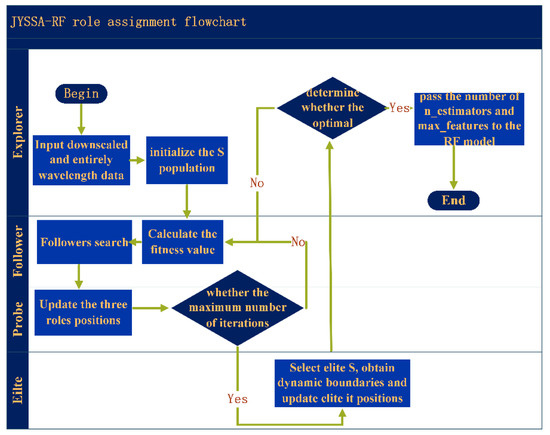 The JYSSA algorithm optimizes the RF classification model, as shown in Figure 5, with the following flow.