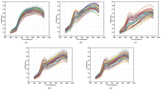 Spectral curves of five kinds of maize seeds with different degrees of mildew: (a) A1 maize seed spectral curve; (b) A2 maize seed spectral curve; (c) A3 maize seed spectral curve; (d) A4 maize seed spectral curve; (e) A5 maize seed spectral curve.