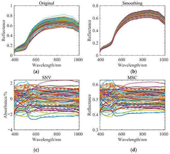 Spectral curve preprocessing: (a) original spectral curve; (b) spectral curve after smoothing; (c) spectral curve after SVN; (d) spectral curve after MSC.