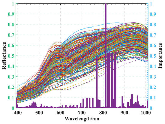 The hyperspectral imaging system provides a wealth of data, but when the number of band operations increases, the training time also increases because the band attribute values are too low, reducing the accuracy [29]. For this reason, RF features and importance ranking were used. All bands were given their scores, facilitating the screening of high-priority bands. Figure 8 mainly shows the 186 feature bands with importance scores greater than 0, which were screened in the experiment for comparison with the full 462 bands.