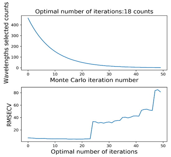Feature bands were selected based on preprocessed data. As part of the selection process, competitive adaptive reweighted sampling (CARS) was adopted, which relies primarily on Monte Carlo analysis and PLS regression to find the feature wavelengths. After continuous PLS cross-validation (RMSECV) shrinking, a maximum root-mean-square error characteristic wavelength subset was found, and the PLS model was re-established through the new subset according to Darwin’s theory of evolution. There were eight training sets and two test sets in the wavelength dataset, and the number of Monte Carlo samplings was fixed. In Figure 9, the absolute weight of the regression coefficient is shown for each sampling process. When determining the optimal characteristic wavelengths, small absolute wavelengths were discarded directly through the decreasing function (EDF) and then cross-validated to minimize the RMSECV.