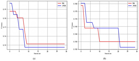 There is a clear trend that the SSA jumps out of the local optimum but does not continue to search for the optimal solution, while the JYSSA algorithm continues to decline after jumping out of the local optimum, and its ability to jump out of the local optimum and search for the global optimum is improved compared with the original algorithm. Table 2 and Table 3 optimize parameters between different algorithms for band 462 and band 186, respectively. Figure 10 compares the convergence and degree of adaptation of the SSA and JYSSA algorithms. The optimal adaptation degree is taken to evaluate the performance of the algorithm, and the lower the optimal adaptation degree, the better the algorithm’s effect [30].
