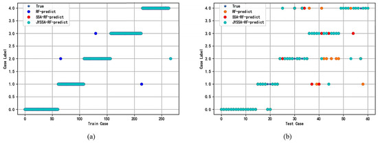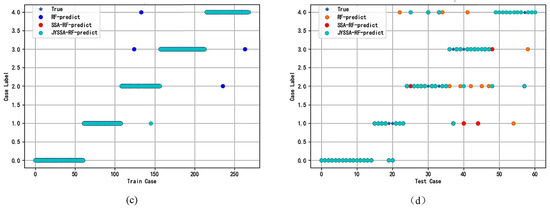 The ordinary RF model was constructed using an RF classifier with n_estimators = 5 and max_features = 3 in the training classification mode. The SSA and JYSSA algorithms’ optimized parameters are reflected in Section 2.3. The comparison of the three algorithms of the test set and training set under 462 bands and 186 bands is shown in Figure 11, and the training set prediction results are represented in different legends to judge whether the training set is accurate with respect to the coverage degree of scattering and the true value, where the blue pentagram represents the true value label, and the blue dots, red dots, and green dots represent the training set prediction of the RF, SSA-RF, and JYSSA-RF models, respectively. The yellow, red, and green dots represent the test sets of the RF, SSA-RF, and JYSSA-RF models, respectively.