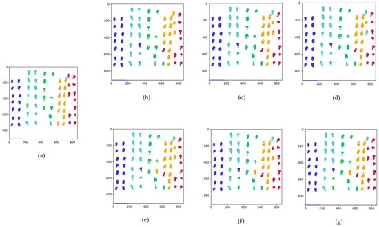 For better visualization of the predictive ability of the model, Figure 12 shows the visualization of the seed prediction and distinguishes it by different colors, where columns one and two represent A1 in blue, columns three and four represent A2 in cyan, columns five and six represent A3 in green, columns seven and eight represent A4 in yellow, and columns nine and ten represent A5 in red. (a) shows the true label value of the original image, while panels (b), (c), and (d) show the RF model, SSA-RF model, and the JYSSA-RF model, respectively, for the seed prediction under the full waveform. From the prediction images, the prediction effect for heavy mildew is not very good. Panels (e), (f), and (g) show the predictions of the three models under 186 bands, respectively, and it can be seen that the prediction effect for heavy mildew is significantly improved.