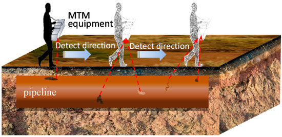 Long-distance pipelines are subject to defects, corrosion, cracks, and other safety hazards during service. Oil and gas leaks can lead to significant losses to the national economy and serious environment pollution. Therefore, it is crucial to regularly test pipelines for safety. Nondestructive testing (NDT) methods that are based on the principle of metal magnetic memory [1,2] have been widely used in recent years for the safety inspection of oil and gas pipelines. However, because of the special structure and geographical layout of the pipeline, for example, where pipeline pigs are inaccessible [3,4], it is not easy to implement internal inspection; therefore, external inspection of the pipeline can be performed. Magnetic tomography method (MTM) detection [5], developed by the Russian Transkor-K Center, is an emerging method for non-contact external detection. Compared with the traditional internal detection method, the MTM is used to detect buried pipelines without digging the overlying soil. This method is currently used for the online inspection of buried and submarine pipelines [3,5,6].