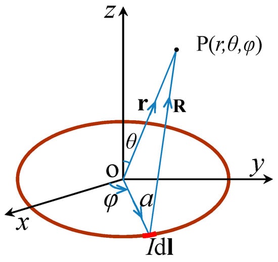 The magnetic dipole is represented by a current-carrying coil [15,16]. There is a field point P in space; the vector radius is r, the radius of the current-carrying coil is a, and the vector radius from the source point to P is R. The angle between the current element Idl and the positive x-axis is . Equations (1) and (2) can be obtained as: