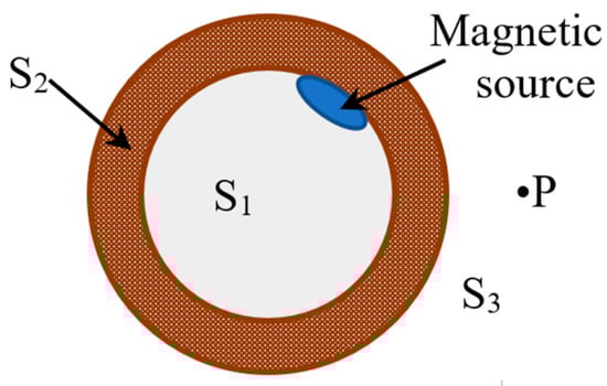 If the interference field is not considered, the spatial field containing the pipe under the action of a magnetic source can be divided into three parts. They are the inner cavity S1, pipe body S2, and spatial domain S3 from the outer wall of the pipe to infinity, as shown in Figure 3, where P is any point in S3 and the magnetic source is the stress concentration zone.